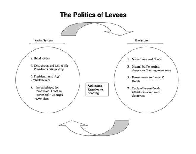 - Give students a brief description of the devastation experienced during Hurricane Katrina. Pass out a copy of the Diagram 'The Politics of Levees' (below), and walk through the cycle that occurred between the social and ecosystems during the crisis of Hurricane Katrina. Students can draw a line connecting each action and reaction. This front-loading activity will help them understand the news article they read in the next step.