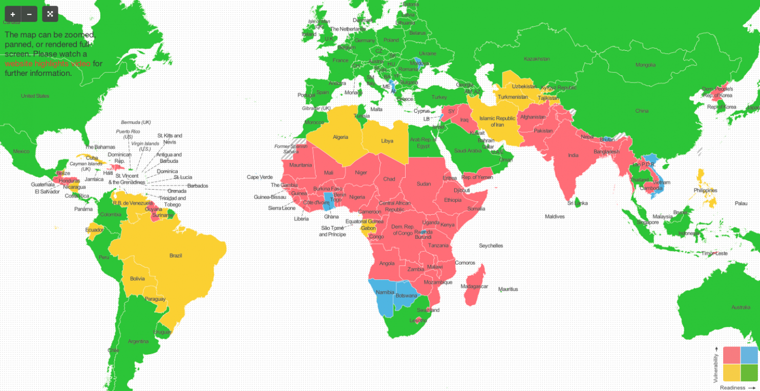 What is the best place to weather climate change? Research by the Notre Dame Global Adaptation Index, or ND-GAIN, suggests it is Scandinavia. In a pinch, though, any developed country will do. As these maps by ND-GAIN illustrate, developed countries are far less vulnerable than developing countries to the risks of climate change.
