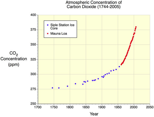 Figure 1: The following graph illustrates the rise in atmospheric carbon dioxide from 1744 to 2005. Note that the increase in carbon dioxide's concentration in the atmosphere has been exponential during the period examined. An extrapolation into the immediate future would suggest continued increases. (Source: PhysicalGeography.net)