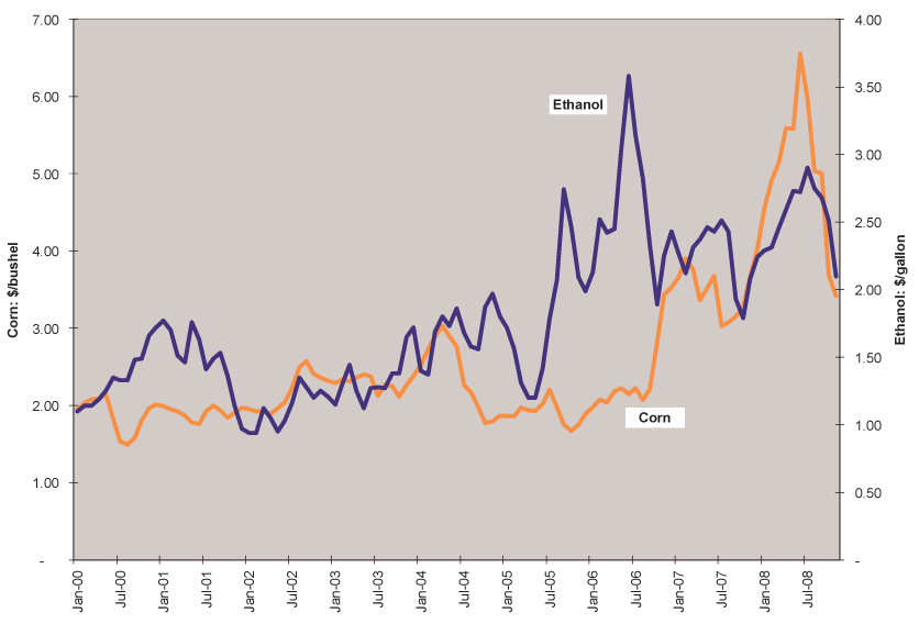 Figure 3. Corn Versus Ethanol Prices, 2000-2008