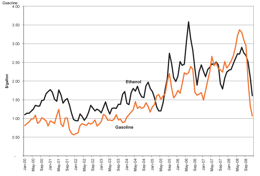 Figure 4. Ethanol and Gasoline Prices, 2000-2008