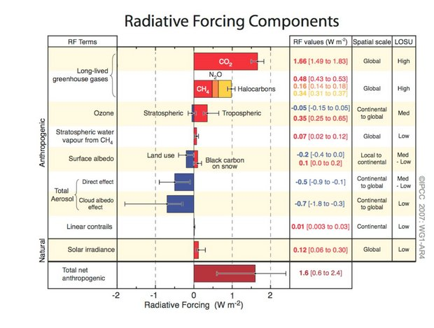 The IPCC also found that anthropogenic contributions to aerosols in the atmosphere produce cooling effects, referred to as global dimming. However the cooling (global dimming) effects due to human-caused aerosols are equivalent to about half of the warming effects due to the combined radiative forcing of human-produced greenhouse gases, causing a net warming.
